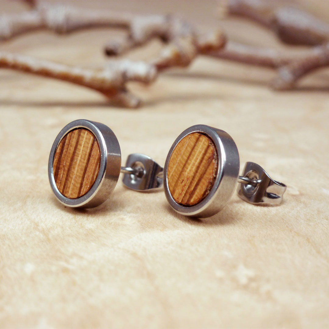 Handmade menโs wood stud earrings in stainless steelโlightweight, hypoallergenic, and gift-ready. Natural style, all-day comfort.