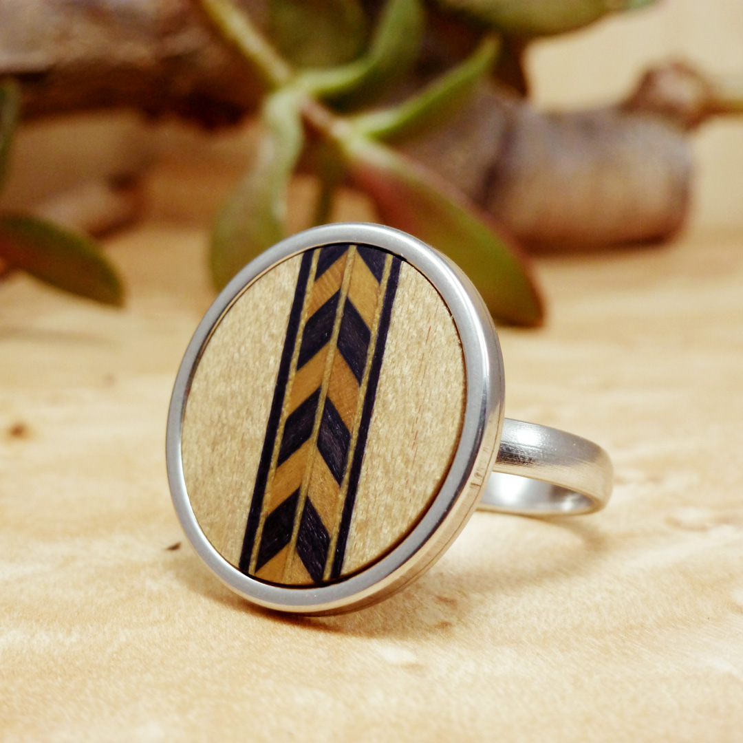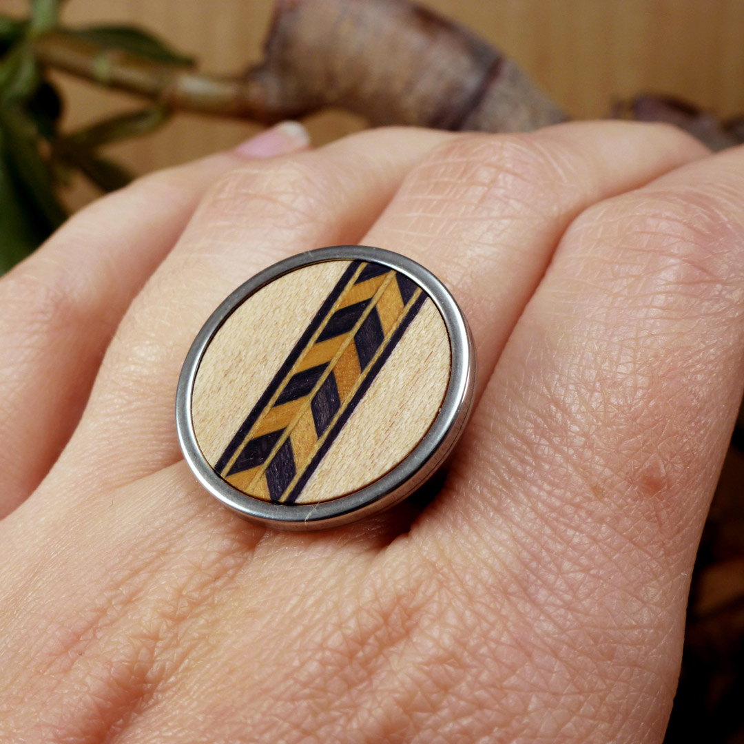 Discover this modern metal ring with wood inlay. Handmade with natural wood and stainless steel. A perfect boho ring for any occasion!