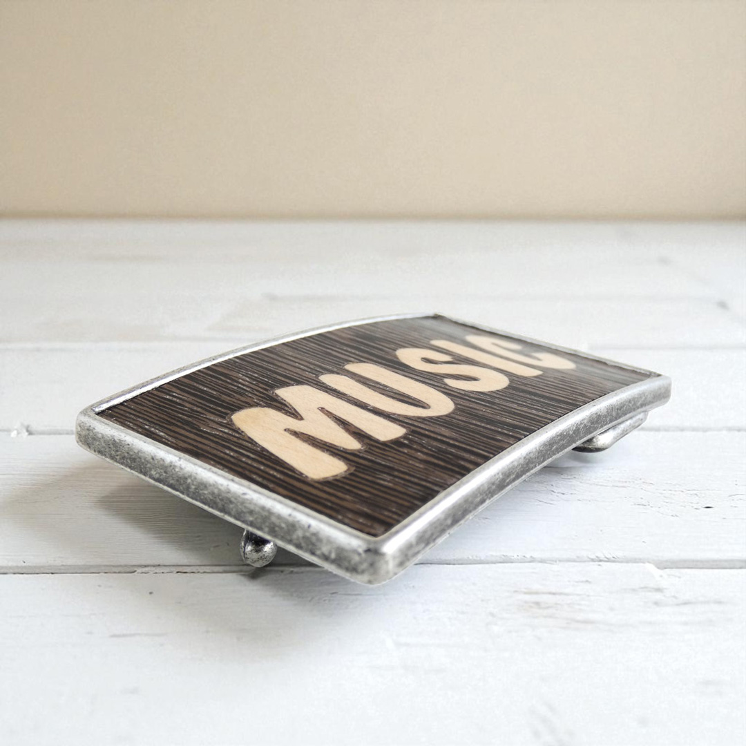 This music belt buckle is a bold, handcrafted accessory for music lovers. The word MUSIC is created using the traditional art of marquetry: each letter is carefully hand-cut from natural sycamore and wenge wood, then inlaid into a solid metal base with a slight curve to follow the shape of your waist comfortably.
