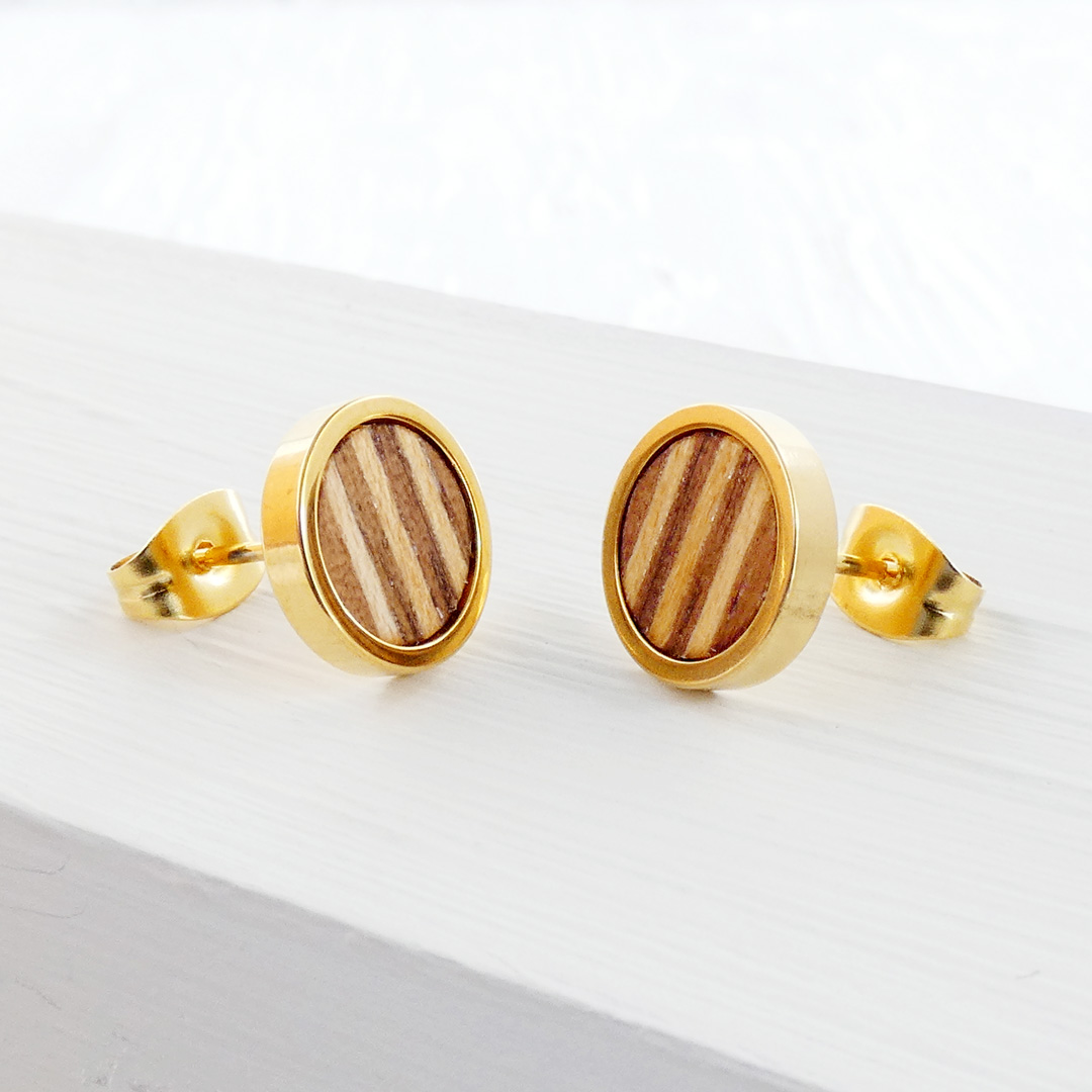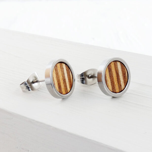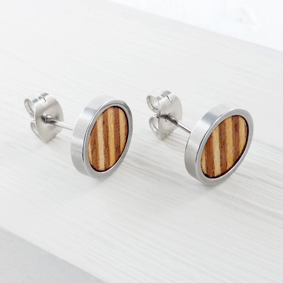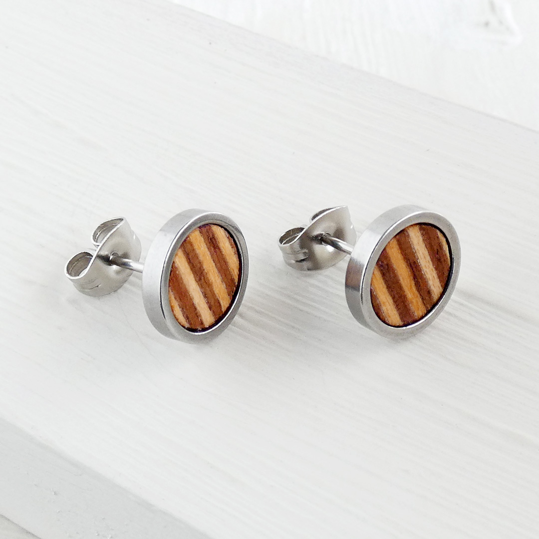 Every pair of these wood stud earrings is crafted by hand, ensuring quality and uniqueness in every piece. I start by cutting thin strips of walnut and sycamore wood and carefully assembling them to create the distinctive striped linear pattern. Once the design is set, I use a Crossbow Saw (a traditional tool without a motor) to cut the perfect circular shape for each earring.