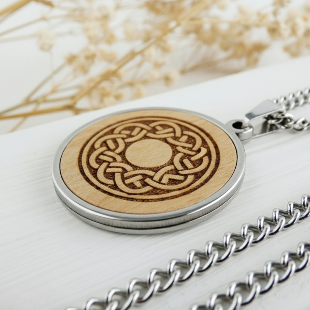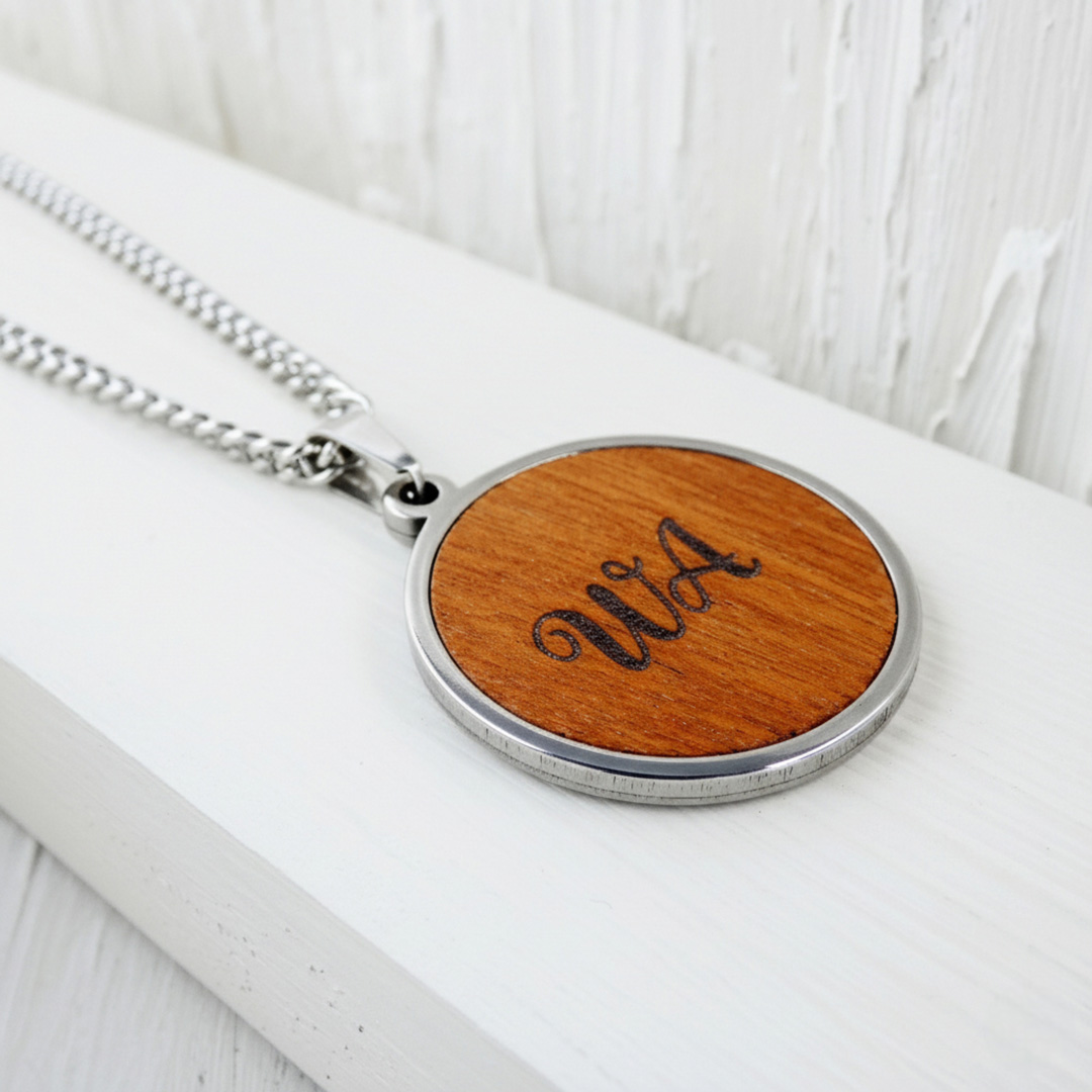 I keep things simple and friendly. You choose your wood—sycamore, boxwood, or cedar—and your chain length. The pendant sits in a stainless steel base, so it’s sturdy and long-lasting. It has a 1.30 inch (33 mm) diameter, which feels bold but still easy to wear every day. It’s unisex, so it works for anyone. I engrave your Custom Engraved Design with care, so each line is clean and readable.