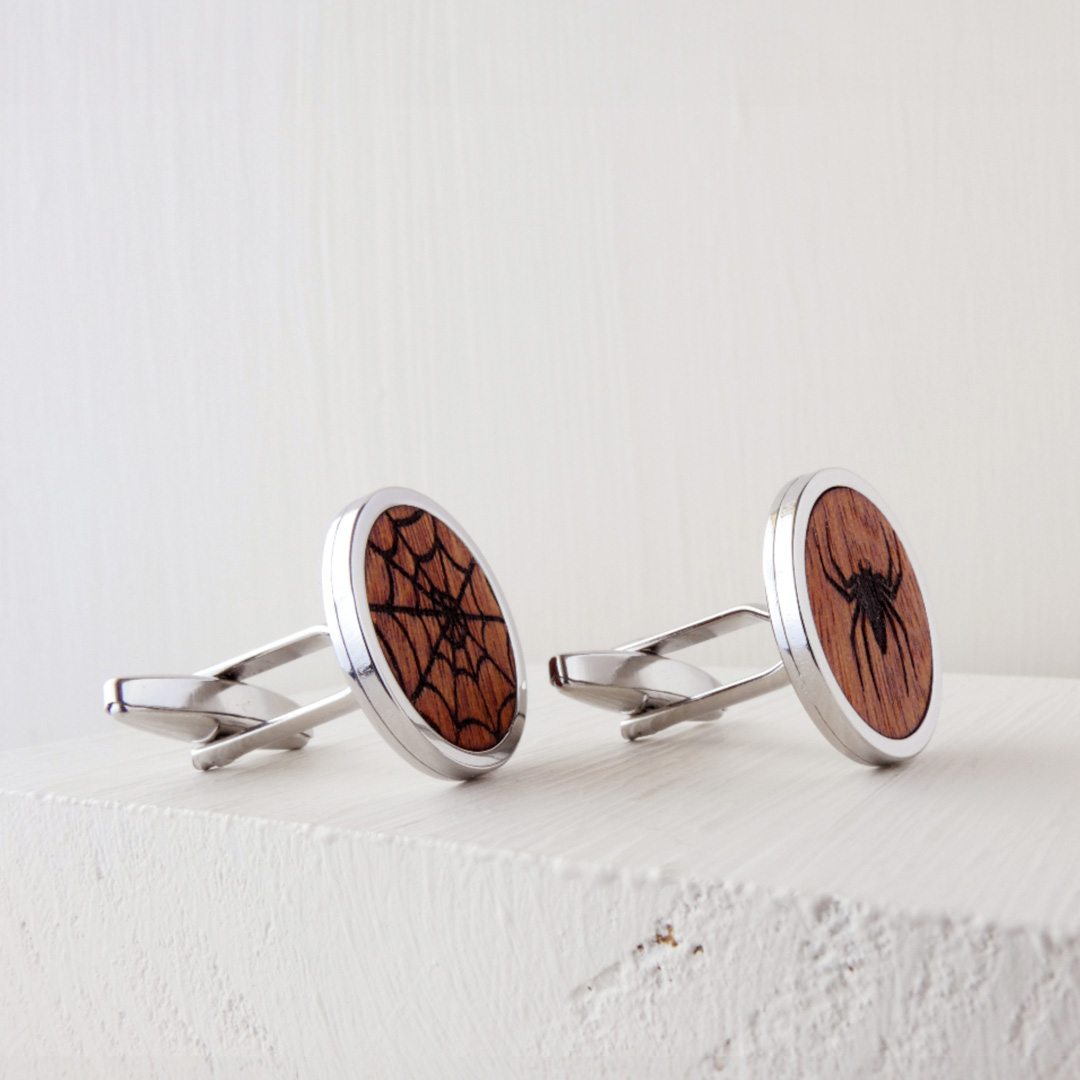 The spider web cufflinks come in several wood options, each offering a different vibe: