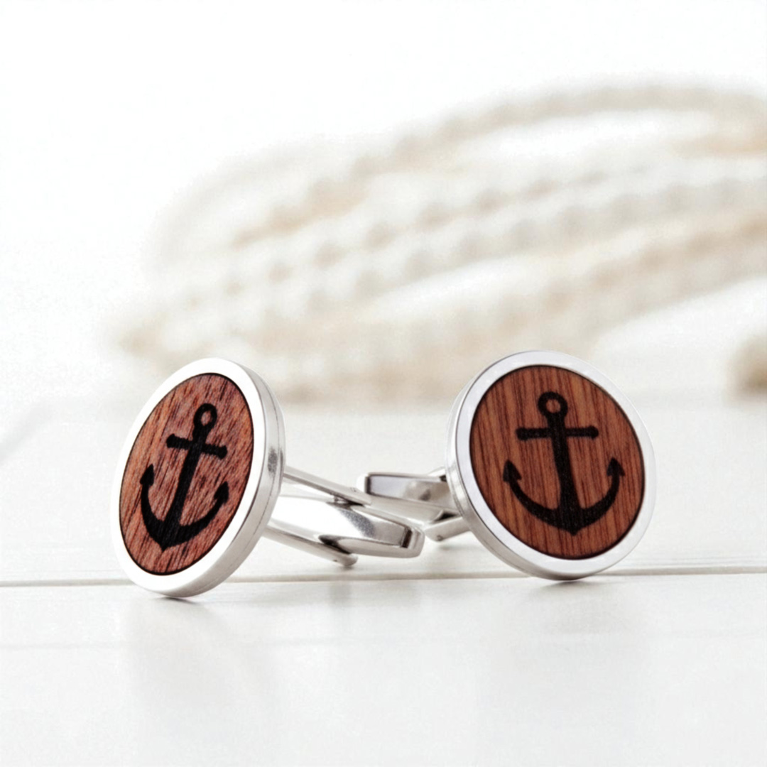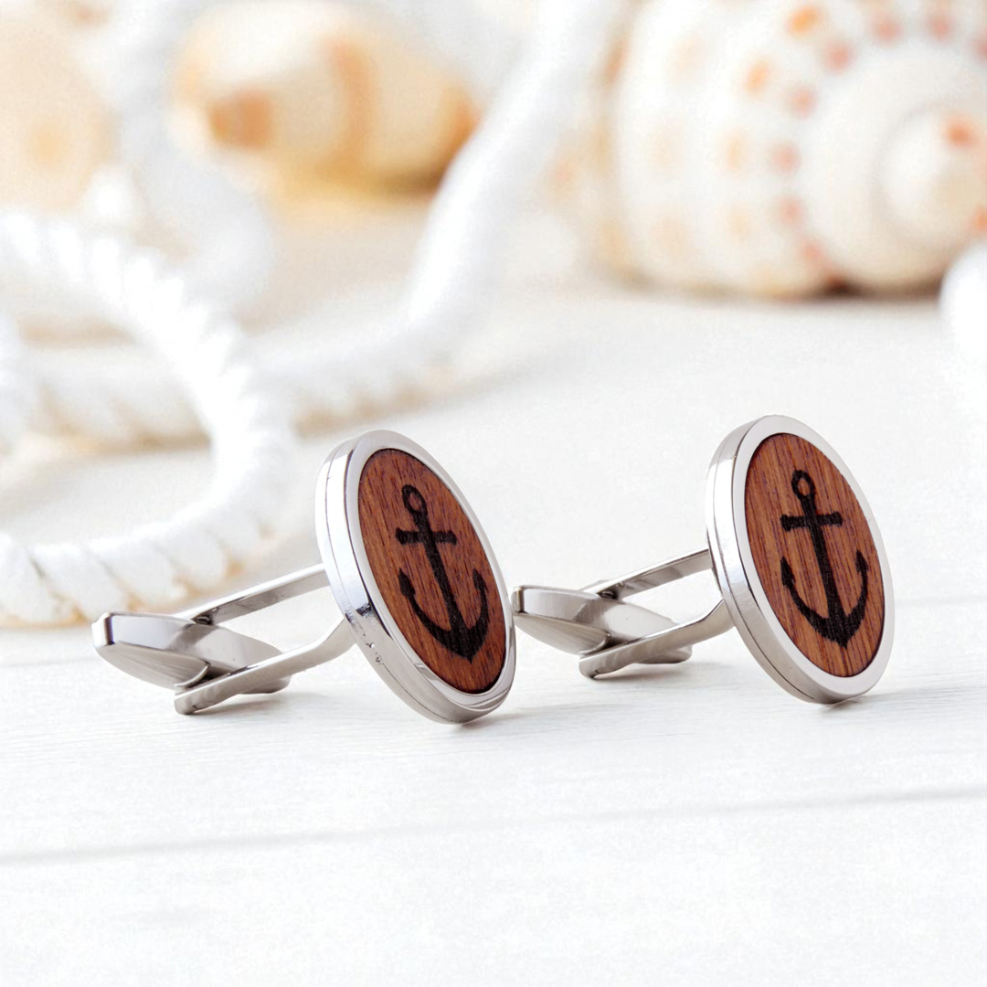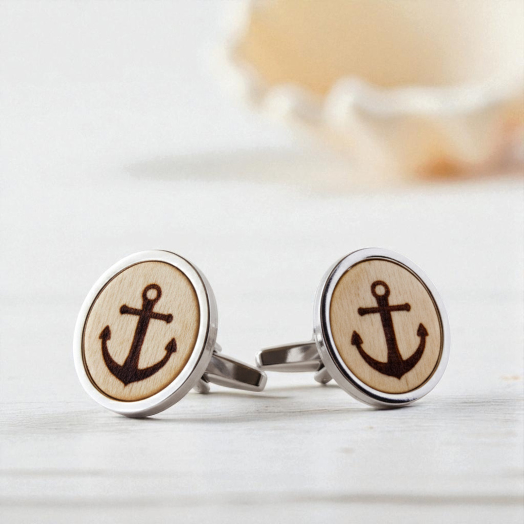Handmade wooden anchor cufflinks—refined engraved cufflinks and a nautical accessory for sea lovers. Gift-ready presentation, free shipping.