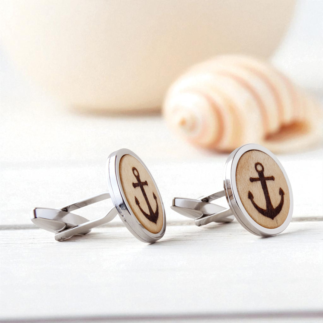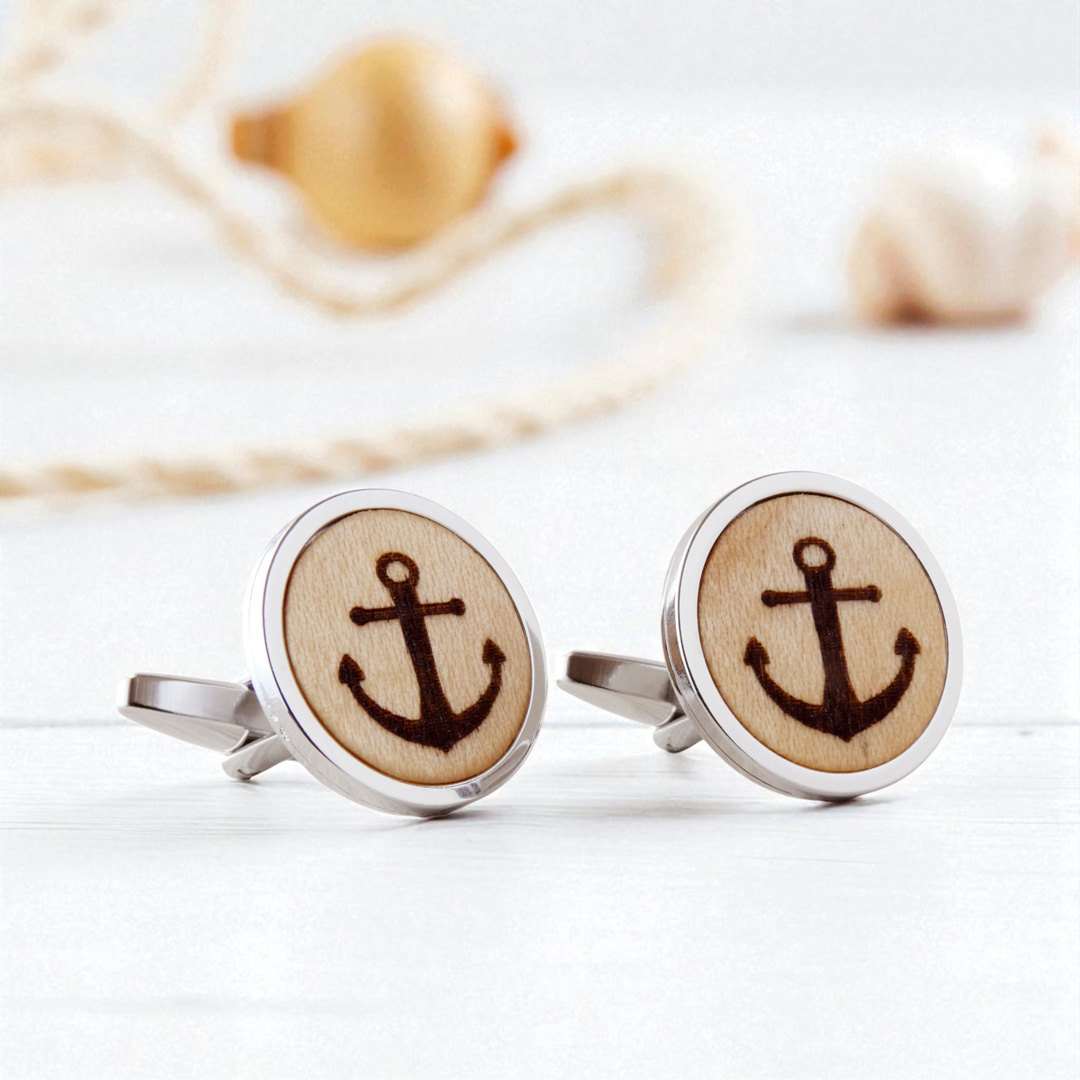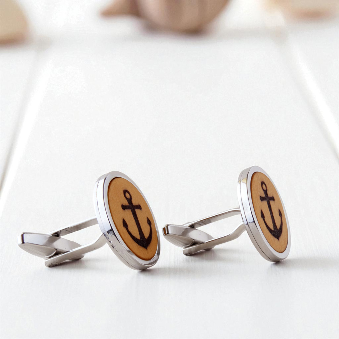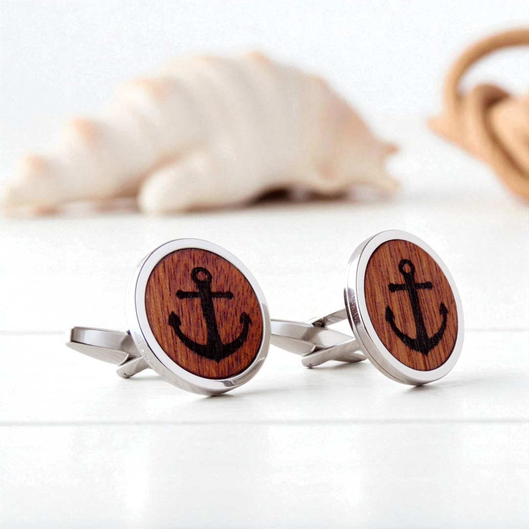 Handmade wooden anchor cufflinks—refined engraved cufflinks and a nautical accessory for sea lovers. Gift-ready presentation, free shipping.