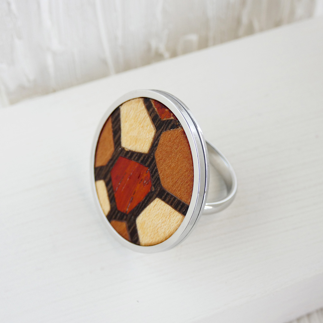 The pieces are carefully glued, pressed, and sanded by hand until the surface is smooth and unified. I then finish the mosaic with a layer of natural oil that protects the wood and highlights its tones. Finally, I set the design into a round stainless steel bezel and attach it to an adjustable ring base.