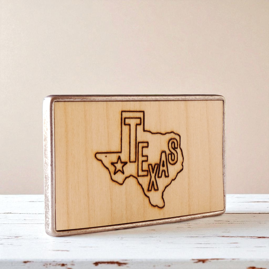 Wooden Texas Belt Buckle – Engraved Map Design for Texas Lovers